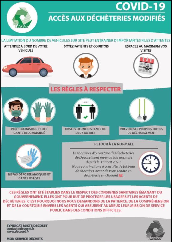 Les déchèteries Decoset de l’ensemble du territoire restent ouvertes aux horaires et jours habituels et ce, jusqu’à nouvel ordre.